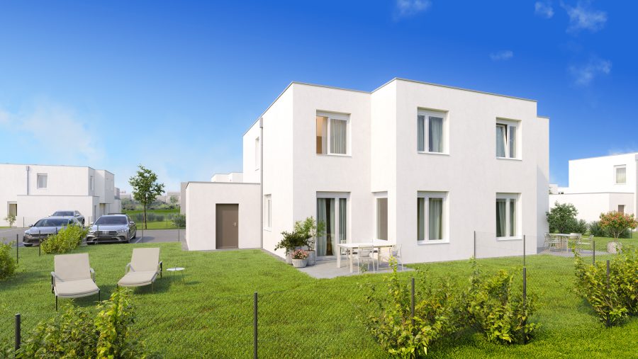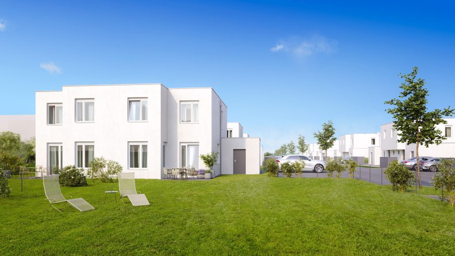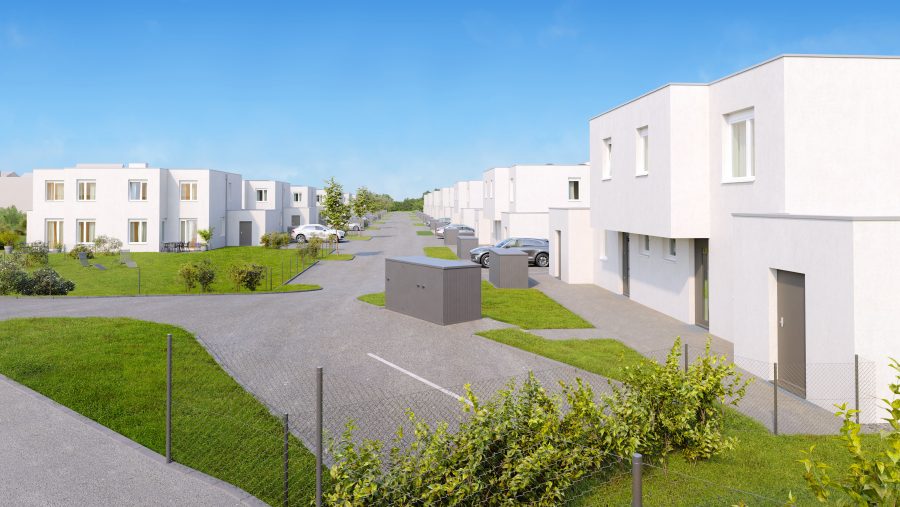 Die familienfreundlichen Häuser mit vier Zimmern und einer Wohnnutzfläche von rund 106 m² werden in Massivbauweise errichtet, als Kellerersatzraum dient ein angeschlossenes Nebengebäude.