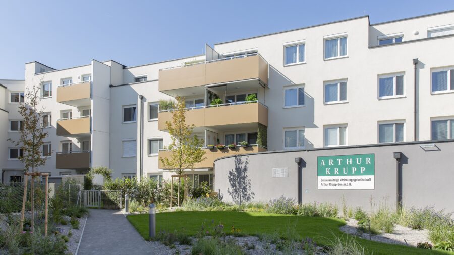 Nach den Plänen von „Natur im Garten“ wurde bei dieser Wohnhausanlage ein spezielles Grünraumkonzept umgesetzt. Ergänzend dazu sind in Zusammenarbeit mit „GRÜNSTATTGRAU“ weitere Begrünungsmaßnahmen umgesetzt worden, die u.a. eine extensive Dachbegrünung und neue Bäume umfassen, die als natürliche Klimaanlage in der Allgemeinbegrünung wirken.